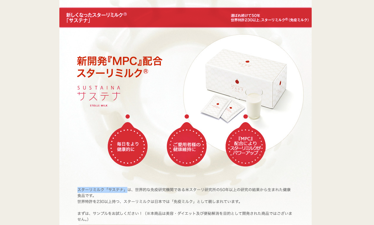 スターリミルク「サステナ」は、世界的な免疫研究機関である米スターリ研究所の50年以上の研究の結果から生まれた健康食品です。