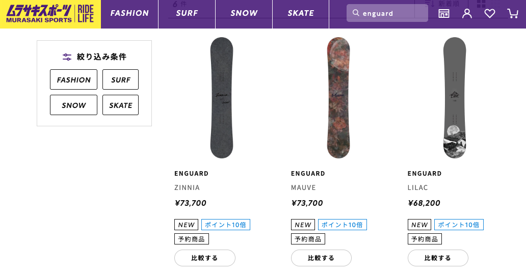 オンラインストアでは、スノーボードやサーフィン、スケートボードといったスポーツ用品はもちろん、