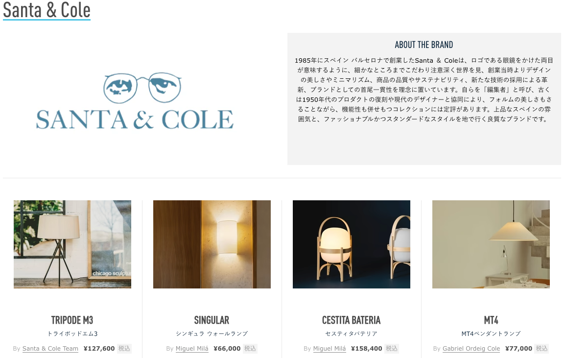 1985年にスペイン バルセロナで創業したSanta & Coleは、ロゴである眼鏡をかけた両目が意味するように、細かなところまでこだわり注意深く世界を見、創業当時よりデザインの美しさやミニマリズム、商品の品質やサステナビリティ、新たな技術の採用による革新、ブランドとしての首尾一貫性を理念に置いています。自らを「編集者」と呼び、古くは1950年代のプロダクトの復刻や現代のデザイナーと協同により、フォルムの美しさもさることながら、機能性も併せもつコレクションには定評があります。上品なスペインの雰囲気と、ファッショナブルかつスタンダードなスタイルを地で行く良質なブランドです。