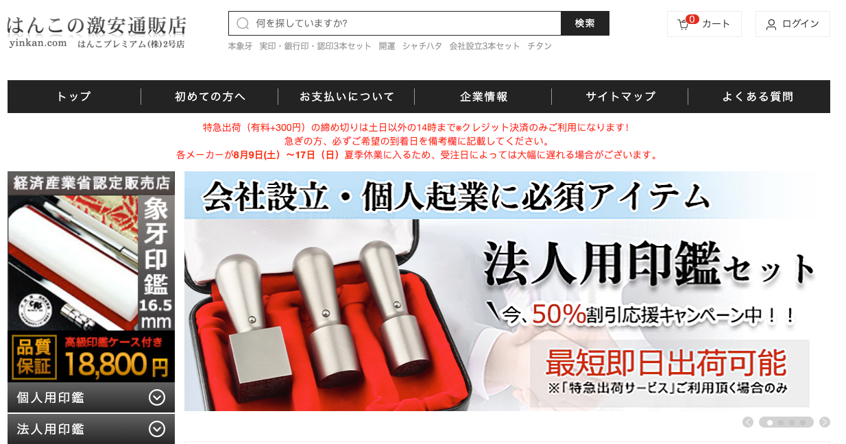 【はんこの激安通販店 Yinkan】は、個人・法人印鑑を最大50%OFFで提供する印鑑専門店です。年間数万本の出荷実績を誇り、日本の熟練職人が一本ずつ丁寧に彫刻。高品質でありながら、驚きの価格を実現しています。