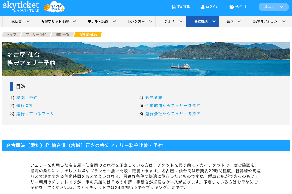 商品名 | スカイチケットフェリー(名古屋 仙台 フェリー) |