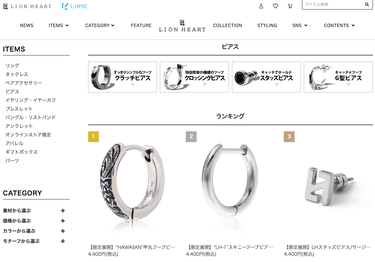 LION HEARTは特にピアスの展開が豊富で、雑誌やセレクトショップでも